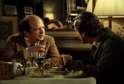 Aside from say, Hitchcock’s purposeful experiments and personal challenges (many of them listed here) Louis Malle’s early-eighties talk fest may be the apogee of single-settings. Essentially an 110-minute conversation, “My Dinner With Andre,” is exactly that, an extended dinner between two friends shot in real time discussing the nature of life, theater and more. The subjects are the peculiar actor Wallace Shawn and his friend and experimental theater director, Andre Gregory. Gregory is an inquisitive dreamer while Shawn is a more cynical typical New Yorker, and while there’s little friction in their discourse, their subtle differences make for an absorbing dichotomy. While it also sounds like cinema verite gone wrong — and it basically goes against every filmmaking and screenwriting 101 rule ever — the dinner with Andre is absolutely engaging, watchable and engrossing. The tastemaking Criterion Collection didn’t put it out as an artifact, they want to make money off it too, you know and they realize it’s an ever-compelling film (and much-drier stuff does exist in their wares — see single setting clunker “Secret Honor” by Robert Altman). During their supper, Wallace and Gregory touch philosophically upon subjects like the nature of life, existence and theater, but always with a open and inviting curiosity; there’s no pedantic answers or postulating — this is colloquy at its best. 100 minutes later when the breaking of bread is done and the wine is drunk, the friends go their separate ways and the audience is left to digest the thoughtful topics discussed. A convention-buster in every sense that defies almost every trope of feature filmmaking and storytelling — it’s not a documentary in any sense and heavily scripted based on real life conversations between the two leads — “My Dinner With Andre” is that rare and enjoyable rule-breaker that every film lover should at least see once. [B+]